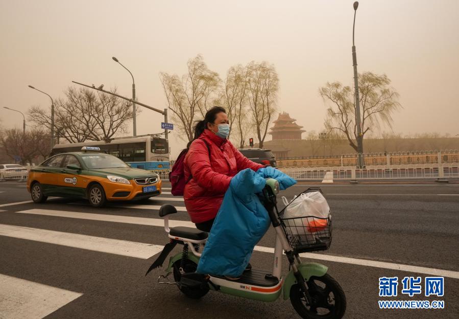 3月15日,市民騎車從北京故宮角樓附近經(jīng)過(guò)。當(dāng)日,我國(guó)北方多地出現(xiàn)沙塵天氣。新華社記者 陳曄華 攝