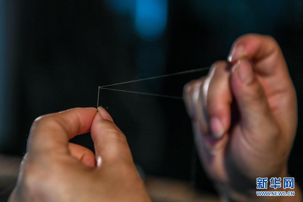 陳英華在位于蘇州高新區(qū)鎮(zhèn)湖街道的蘇繡工作室內(nèi)穿針引線(4月14日攝)。新華社記者 李博 攝