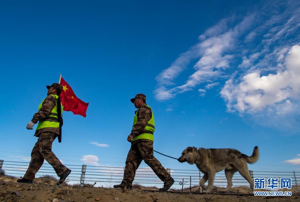新疆生產(chǎn)建設兵團第10師185團職工馬軍武(右)在巡邏途中(4月9日攝)。