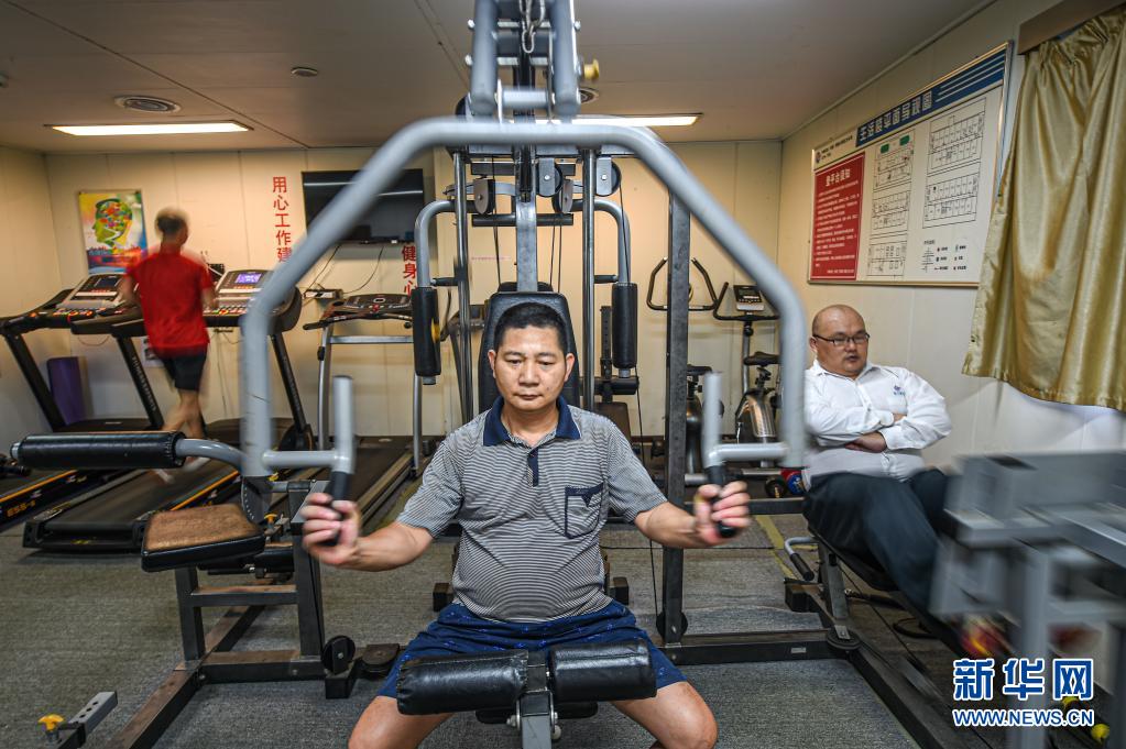 4月25日,工人在中國海油樂東15-1氣田健身房內(nèi)鍛煉身體。