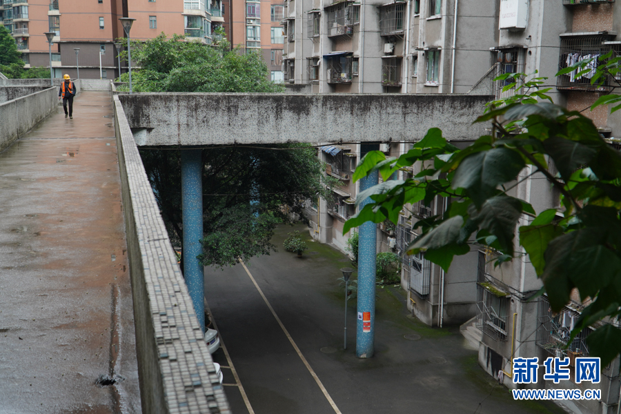 據(jù)了解,該小區(qū)位于重慶市渝中區(qū)長江二路。通過這個空中走廊,居民可以直接走到和天橋齊平的街道上去。新華網(wǎng) 耿駿宇 攝