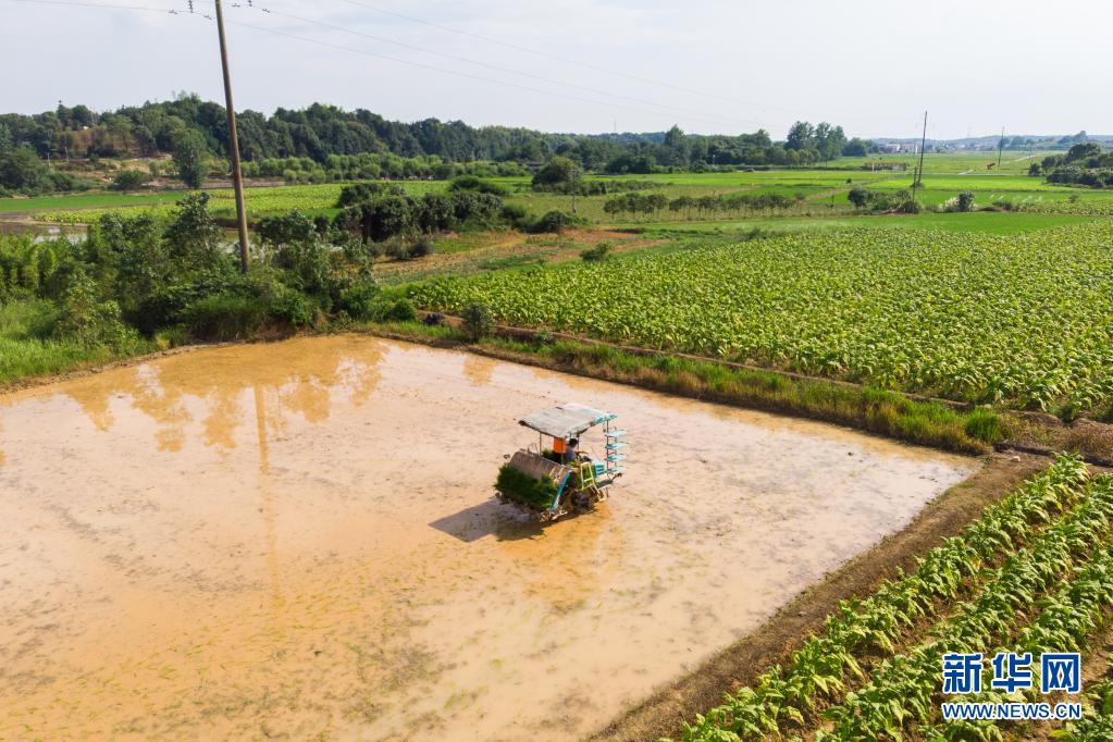 6月26日,湖南瀏陽(yáng)龍伏鎮(zhèn)新開村村民駕駛插秧機(jī)在田間插秧(無(wú)人機(jī)照片)。