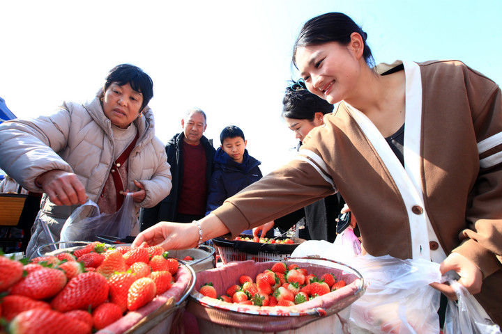 在江苏邳州邢楼镇的邢楼大集上,顾客在选购本地草莓(2月14日摄)。蒯创摄