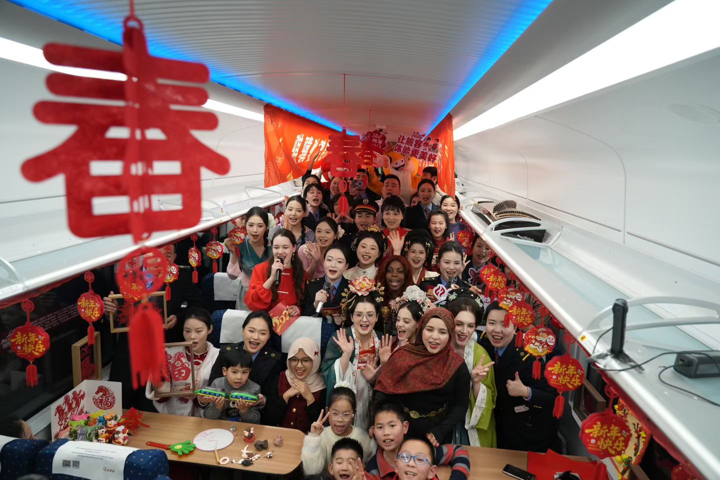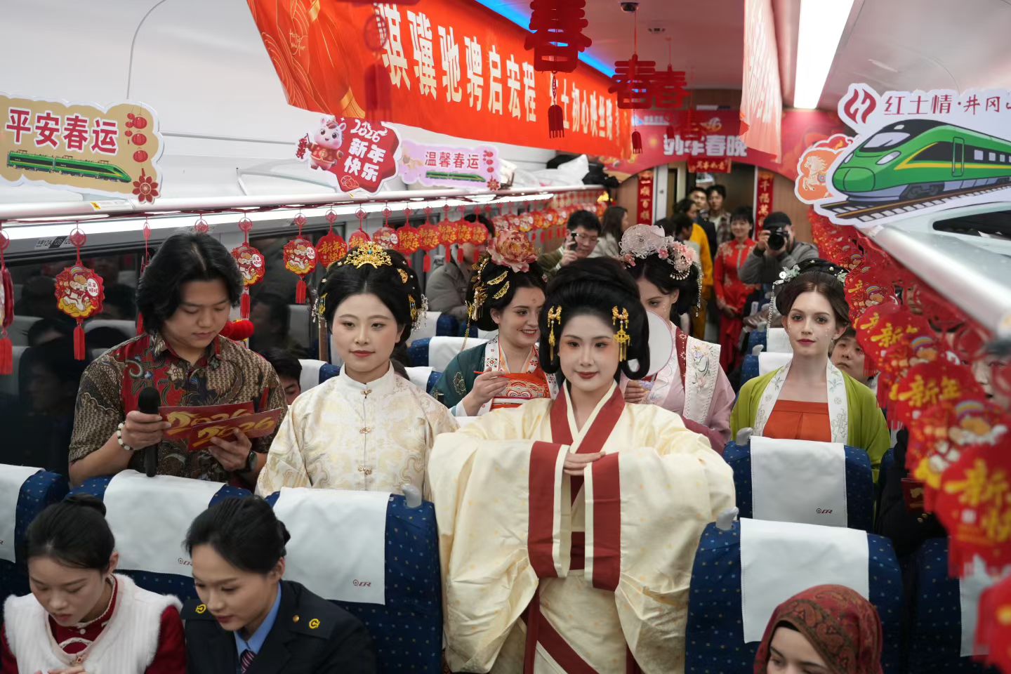 本届列车春晚围绕“铁路连通世界,文化共迎新春”这一主题,精心设计了融合中国传统文化、铁路精神、江西本土风情、国际友谊等内容的节目,通过百米车厢,让中外青年共演、共赏、共情,在旅途中搭建起跨文化对话的桥梁,营造开放包容、互学互鉴的美好氛围。