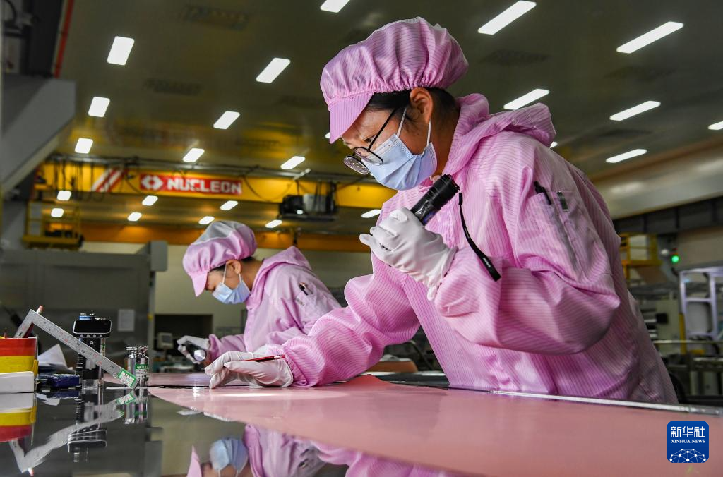 2月24日,在浙江省东阳市南马镇浙江花园新能源股份有限公司生产车间,工人在检测高性能铜箔外观。