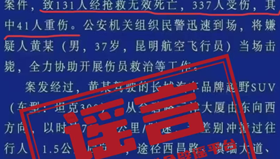 近日,有網(wǎng)民散布虛假的“警情通報”,造謠傳播云南昆明交通事故“致131人死亡,337人受傷”等不實信息,公安機關(guān)核查后,依法對造謠者進行了刑事拘留。“藍(lán)底白字”的“警情通報”是公安機關(guān)權(quán)威發(fā)布的重要渠道。不法分子竟敢冒用官方標(biāo)識,將“2死9傷”惡意篡改成“131人死亡、337人受傷”,并編造聳人聽聞的細(xì)節(jié),真是膽大包天!