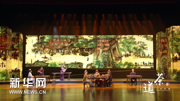 大型茶文化史詩(shī)音樂(lè)劇《茶道:一葉乾坤》亦不同于傳統(tǒng)意義上的舞臺(tái)劇。它引入了五幅精美畫(huà)卷《開(kāi)天辟地圖》《天賜嘉木圖》《千里江山圖》《清明上河圖》《天下一家圖》,呈現(xiàn)主人公華炎的時(shí)空穿梭幻境。全劇通過(guò)他的視角,為觀者帶來(lái)某種“近乎于道”的精神體驗(yàn),需要觀者通過(guò)音樂(lè)、舞蹈、劇情的層層推進(jìn),不斷融入并反觀自己的內(nèi)心,從“茶之道”觀“心之道”,從茶道精神中體悟中華傳統(tǒng)文化“和而不同”的精髓,使每個(gè)人在豐富華嚴(yán)的世界里吸收到支持我們生命和推展生命力量的源頭活水。