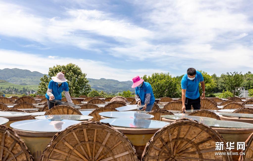 7月10日,工人在畢節(jié)市金沙縣禹謨鎮(zhèn)泡木灣醬醋基地查看醬醋晾曬情況。新華社發(fā)(范暉攝)