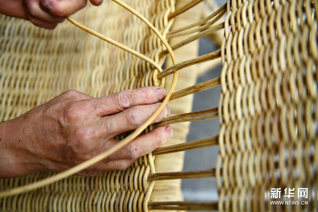 7月10日,在遵義市匯川區(qū)板橋鎮(zhèn)婁山關(guān)社區(qū),居民在藤編作坊里加工藤椅。新華社發(fā)(羅星漢 攝)