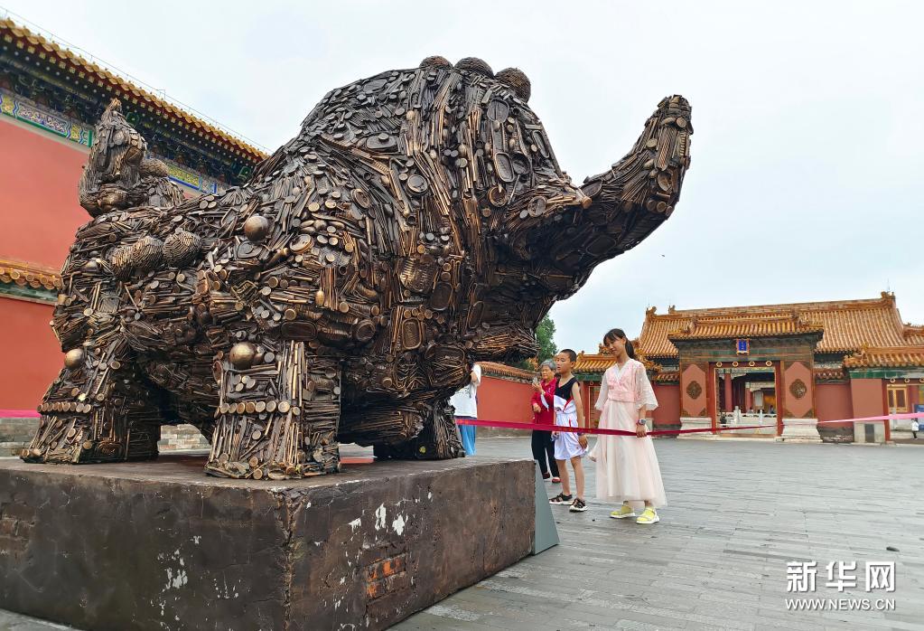這是故宮內(nèi)展出的《福牛辭“舊”》廢棄物再生雕塑(7月13日攝)。新華社記者 金良快 攝