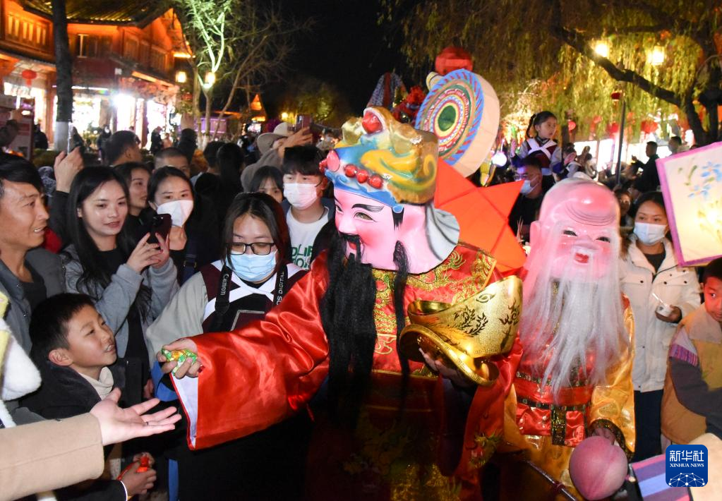 2月5日,在云南省丽江古城的元宵提灯会上,“财神爷”在给游客发糖。