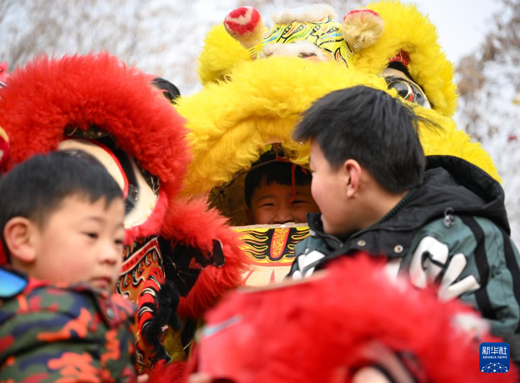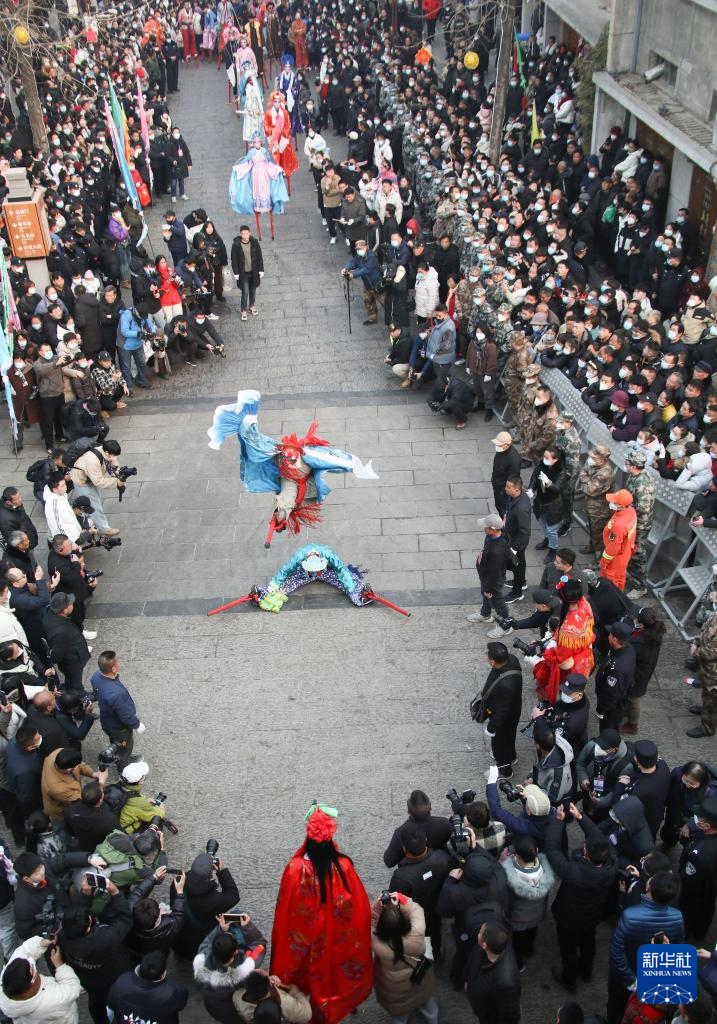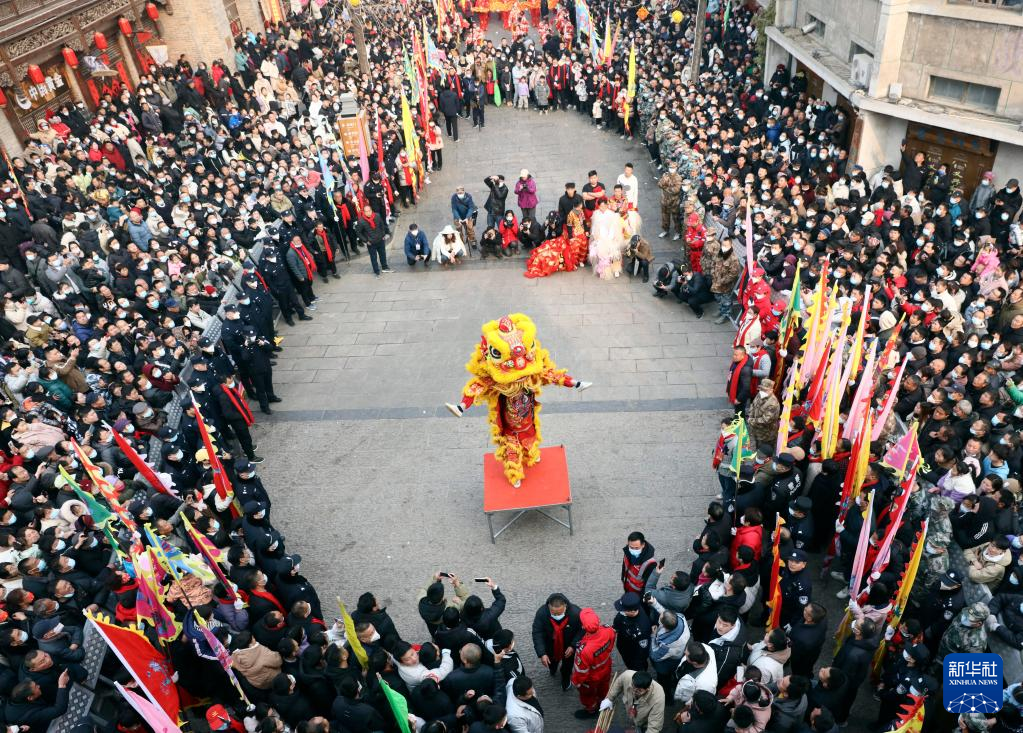 2月6日,社火团队的演员在庙会上表演舞狮(无人机照片)。