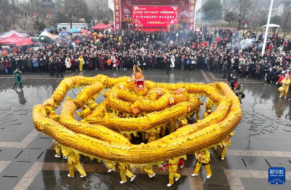 2月6日,人们在全椒县太平文化广场观看舞龙表演(无人机照片)。