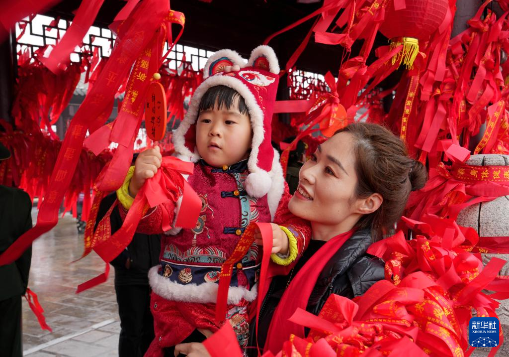 2月6日,一名家长带着小朋友在全椒县太平桥上系“平安带”祈福。