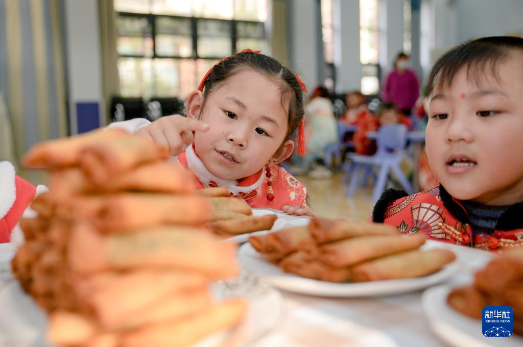2月21日,安徽省合肥市蜀山区南岗镇惠民新村幼儿园的小朋友们参加“吃龙鳞”活动。