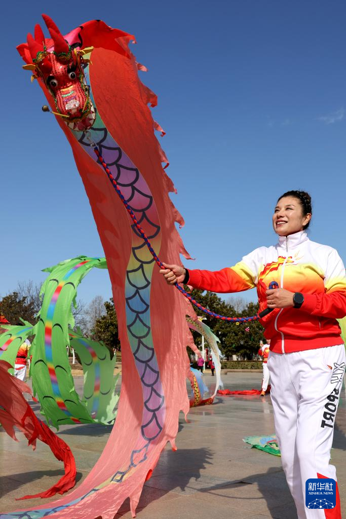 2月21日,人们在山东省滕州市龙泉广场舞彩带龙。