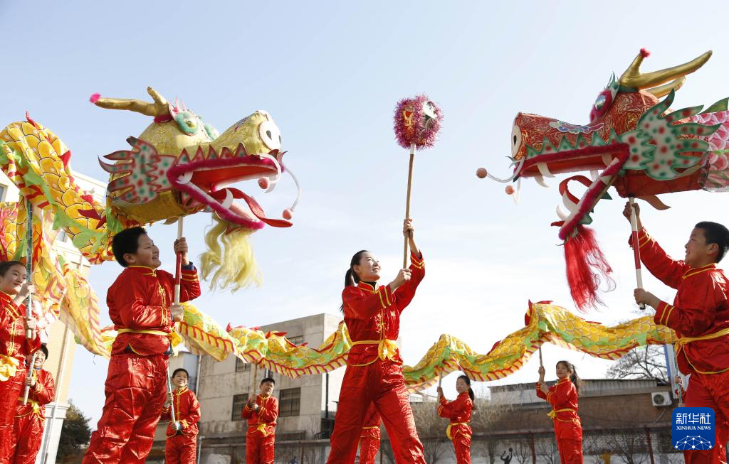2月21日,河北省邢台市东牛角小学学生在表演舞龙。