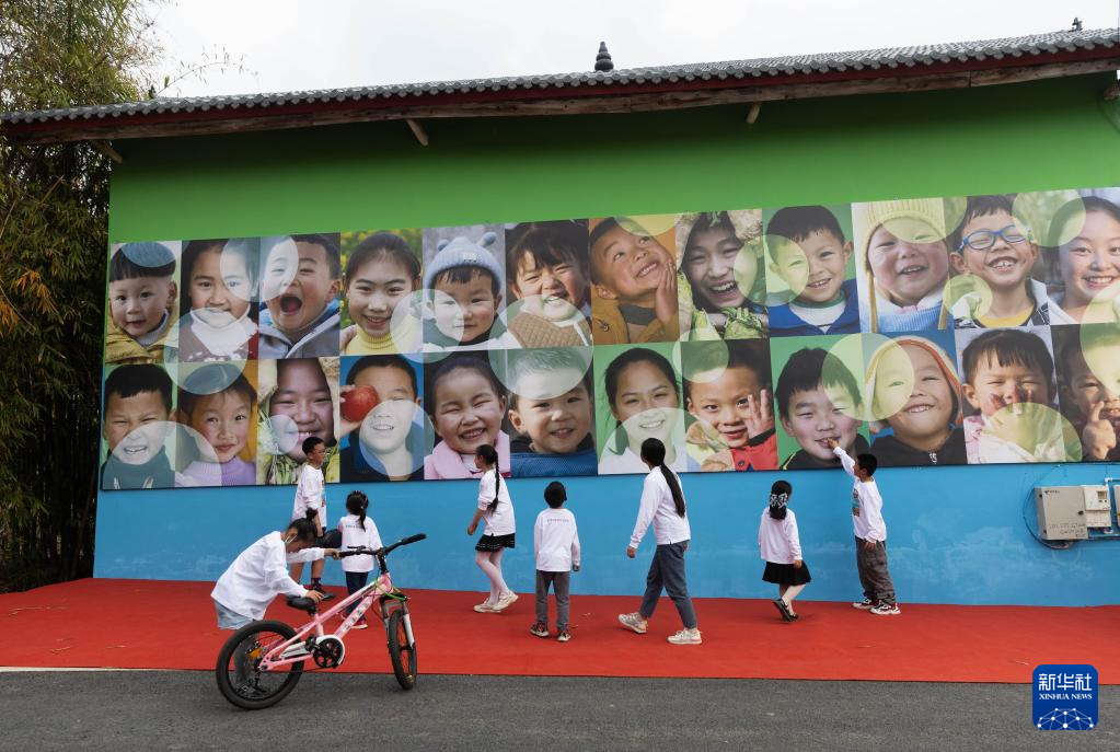 4月1日,宝胜村的孩子们在“笑脸墙”上寻找自己的笑脸。