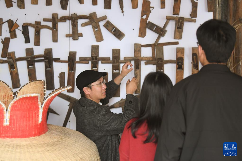 4月3日,姜鹏(左)给游客介绍木工工具。
