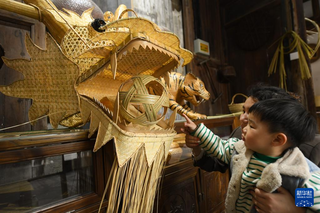4月3日,姜鹏给前来参观的儿童介绍竹编龙头的机关。