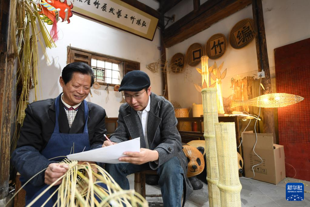 4月3日,姜鹏(右)和篾匠徐明光交流产品细节。