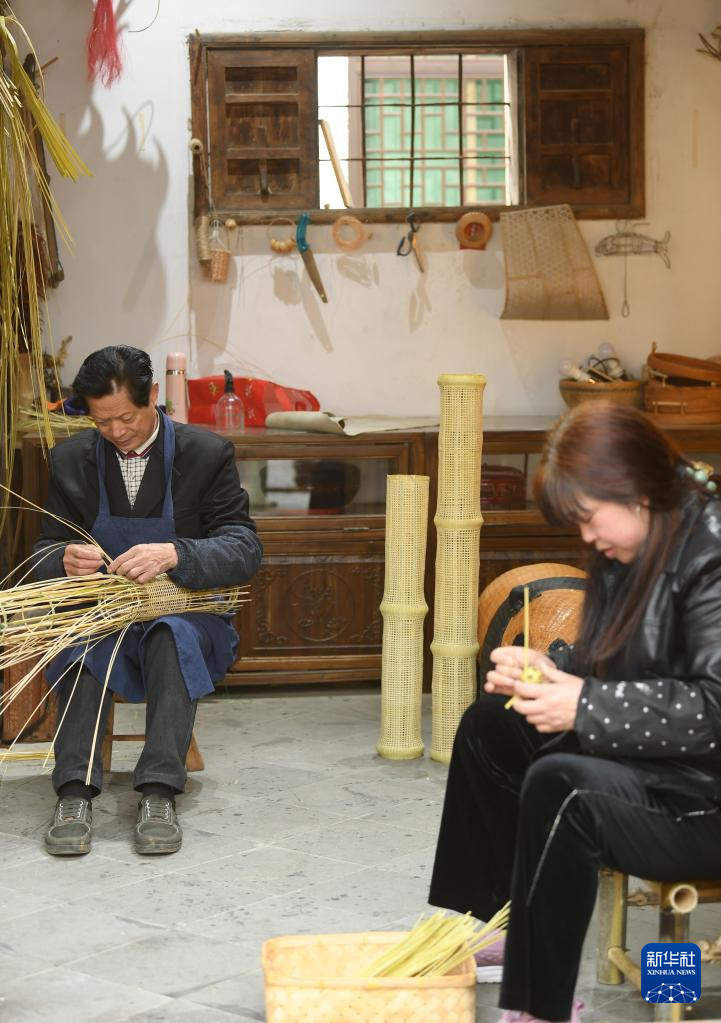 4月3日,村里的篾匠和农户在姜鹏的工作室里编制竹制品。