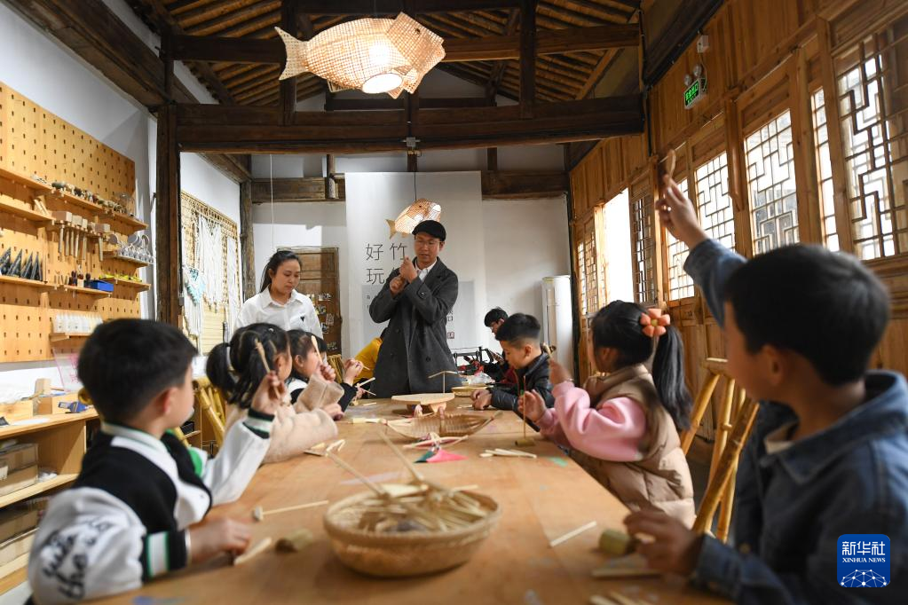 4月3日,前来研学的小学生在姜鹏的工作室制作竹蜻蜓。