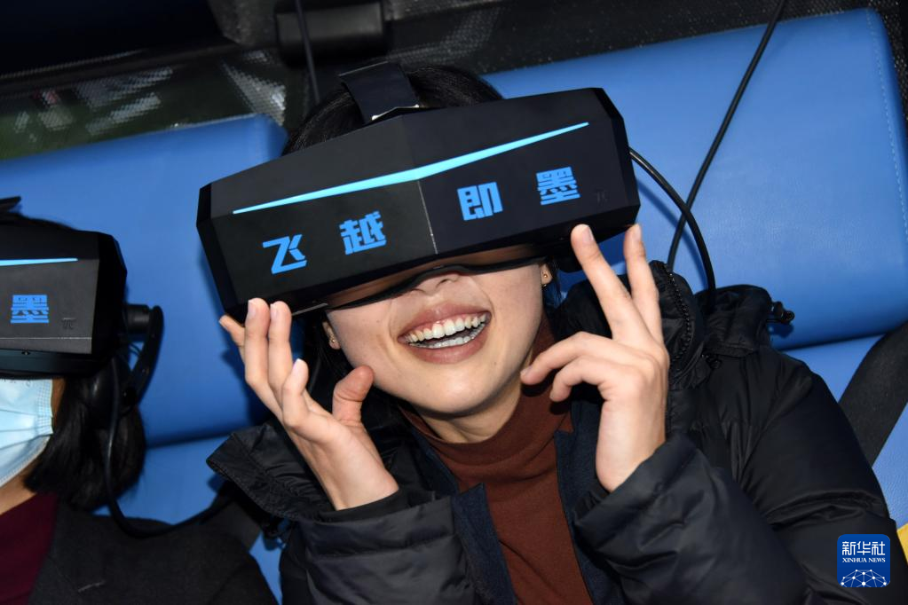 4月6日,参观者在展会上体验景区VR互动项目。