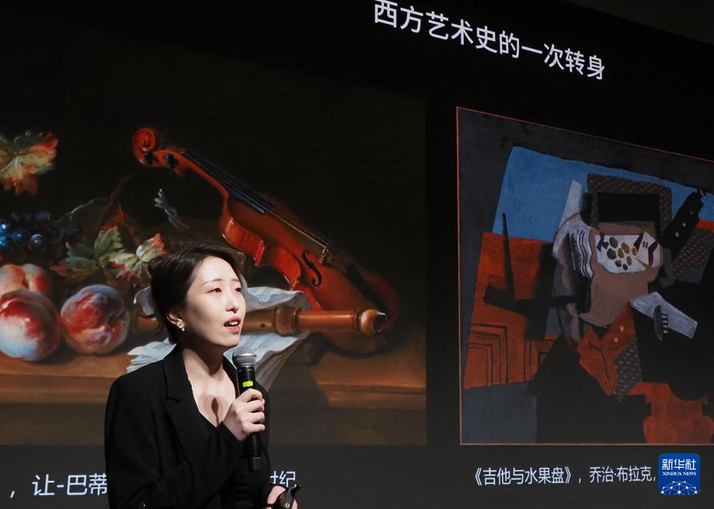 4月8日,上海西岸美术馆导览员康恬在徐家汇书院为市民导览西方艺术展览作品。