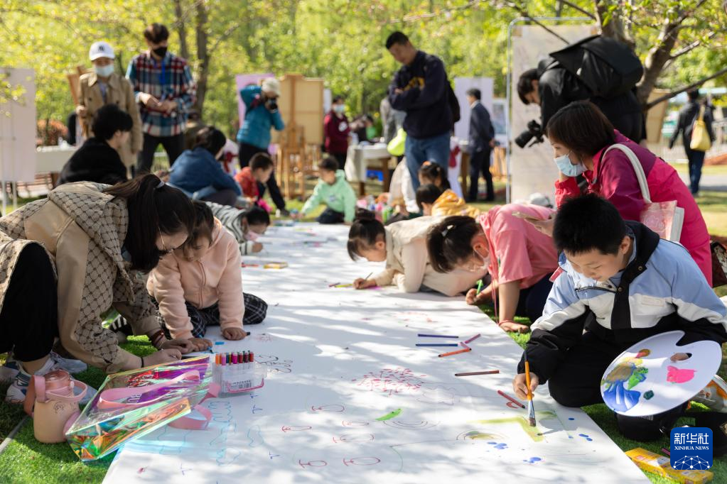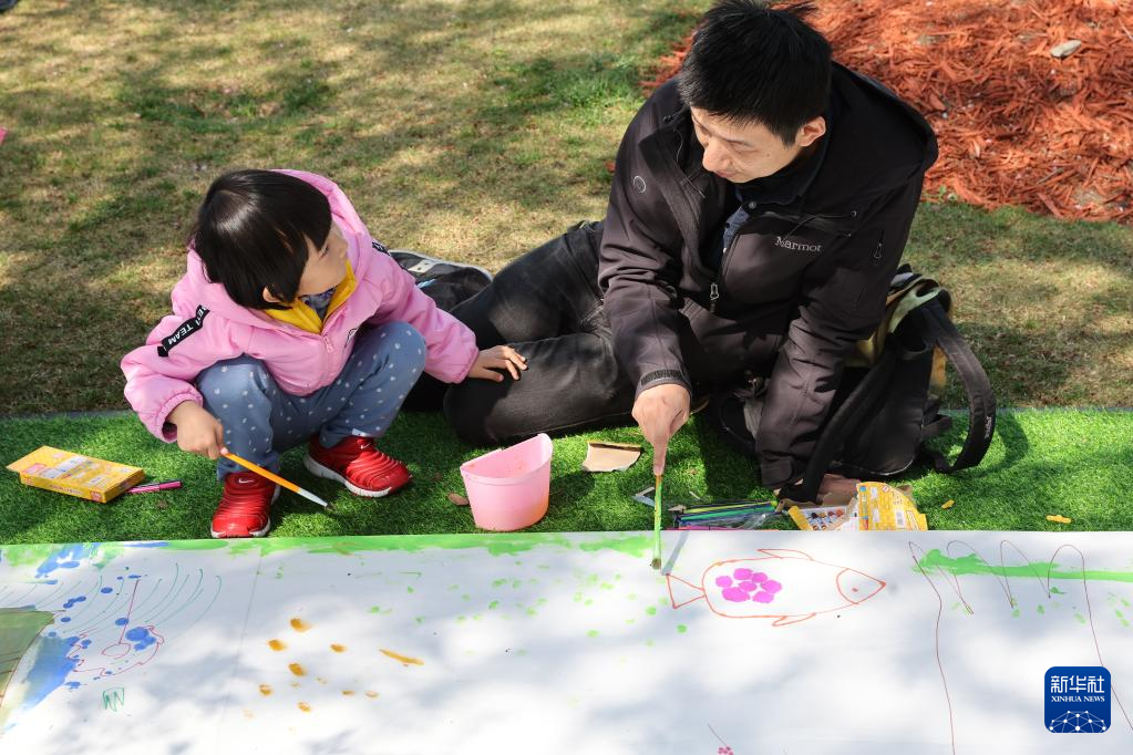 4月8日,家长和孩子在上海市宝山区顾村公园“樱画书艺”活动上创作。