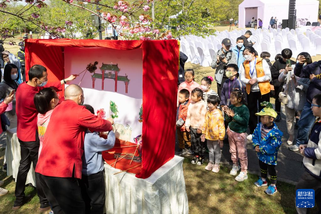 4月8日,孩子们在上海市宝山区顾村公园参加皮影戏现场体验活动。