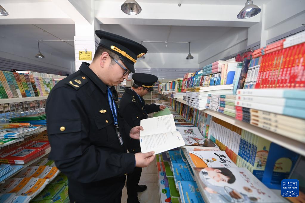 4月7日,诸暨市文化市场行政执法队的工作人员在校园周边书店检查教辅类出版物经营情况。