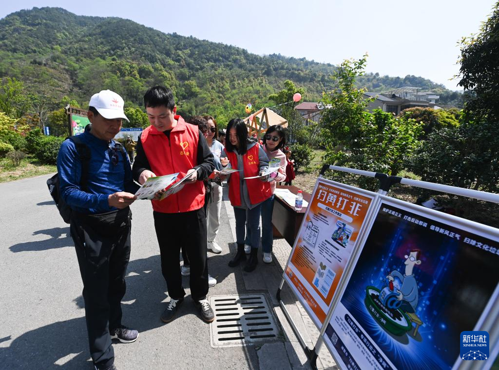 4月8日,诸暨市志愿者在赵家镇皂溪村发放“扫黄打非”科普知识宣传册。