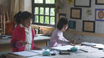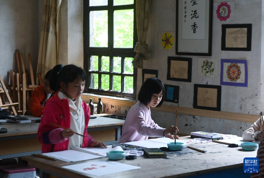 4月12日,诸暨市东白湖镇斯民小学的学生在上国画课。