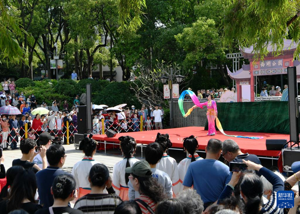 4月15日,在福州西湖上巳节启动仪式现场,市民游客在观赏舞蹈《天女散花》。