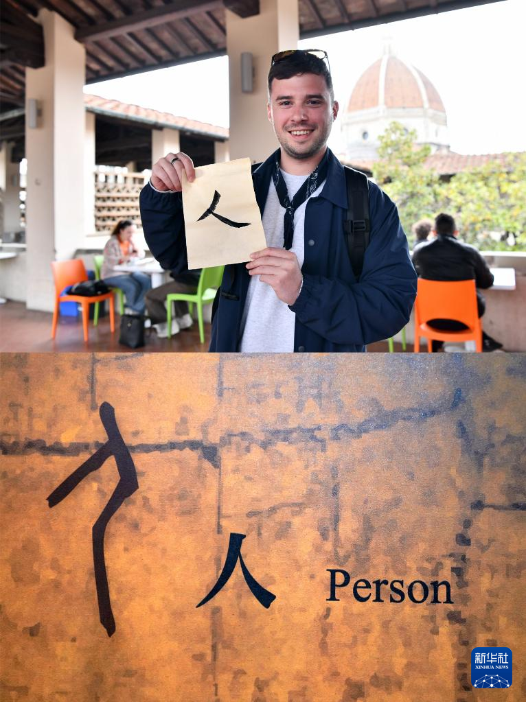 拼版照片:上图为2023年4月13日,在意大利佛罗伦萨大学孔子学院举办的学写汉字活动上,菲利波展示他学习书写的汉字“人”(新华社记者 金马梦妮 摄);下图为2023年4月19日在位于中国河南省安阳市的中国文字博物馆拍摄的“人”字甲骨文(左)(新华社记者 李安 摄)。