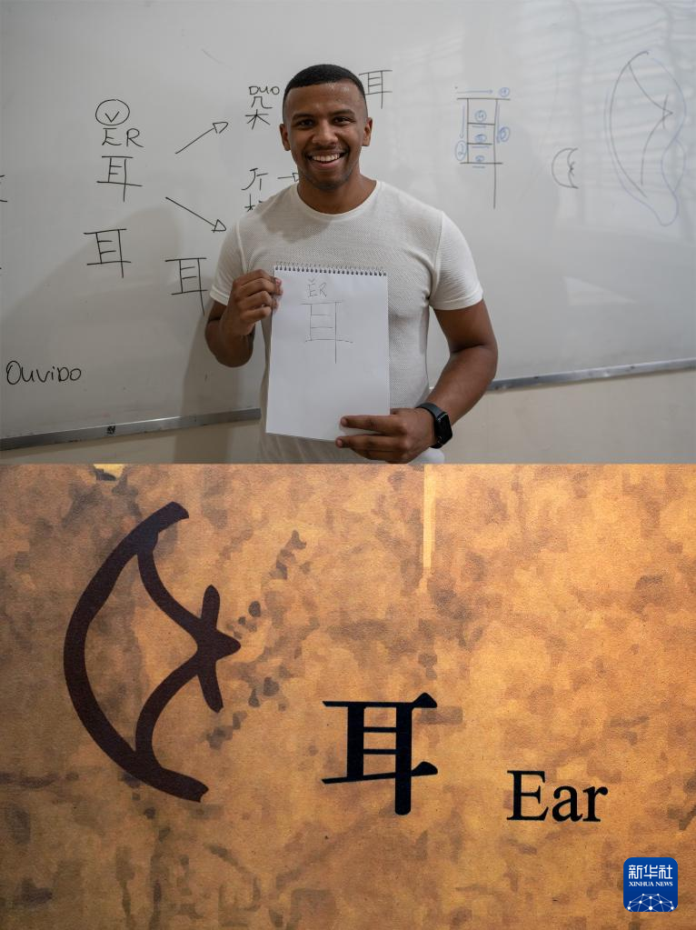 拼版照片:上图为2023年4月18日,在巴西里约热内卢,中文教师吉列尔梅在中文课堂后展示“耳”字(新华社记者 王天聪 摄);下图为2023年4月19日在位于中国河南省安阳市的中国文字博物馆拍摄的“耳”字甲骨文(左)(新华社记者 李安 摄)。
