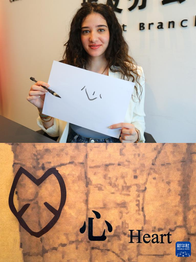 拼版照片:上图为2023年4月13日,在埃及开罗,阿斯玛·穆斯塔法·易卜拉欣展示用毛笔书写的“心”字(新华社记者 隋先凯 摄);下图为2023年4月19日在位于中国河南省安阳市的中国文字博物馆拍摄的“心”字甲骨文(左)(新华社记者 李安 摄)。