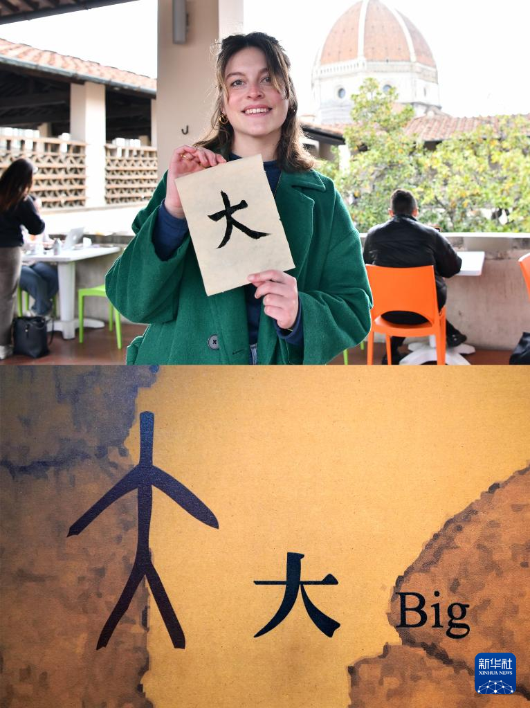 拼版照片:上图为2023年4月13日,在意大利佛罗伦萨大学孔子学院举办的学写汉字活动上,安娜展示她学习书写的汉字“大”(新华社记者 金马梦妮 摄);下图为2023年4月19日在位于中国河南省安阳市的中国文字博物馆拍摄的“大”字甲骨文(左)(新华社记者 李安 摄)。