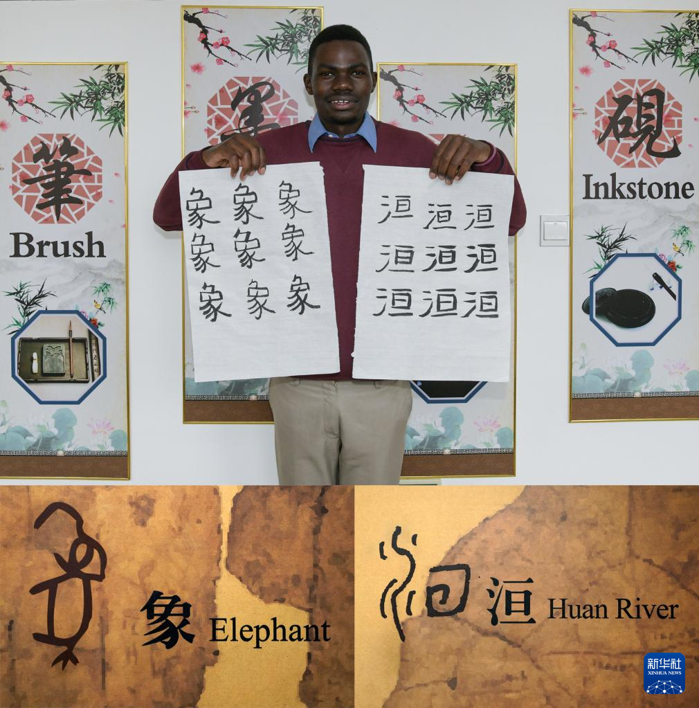 拼版照片:上图为2023年4月17日,阿瓜塔·阿莫斯·米奇拉在肯尼亚内罗毕大学孔子学院展示他用毛笔书写的“象”和“洹”字(新华社记者 韩旭 摄);下左图为2023年4月19日在位于中国河南省安阳市的中国文字博物馆拍摄的“象”字甲骨文(左);下右图为2023年4月19日在位于中国河南省安阳市的中国文字博物馆拍摄的“洹”字甲骨文(左)(新华社记者 李安 摄)。