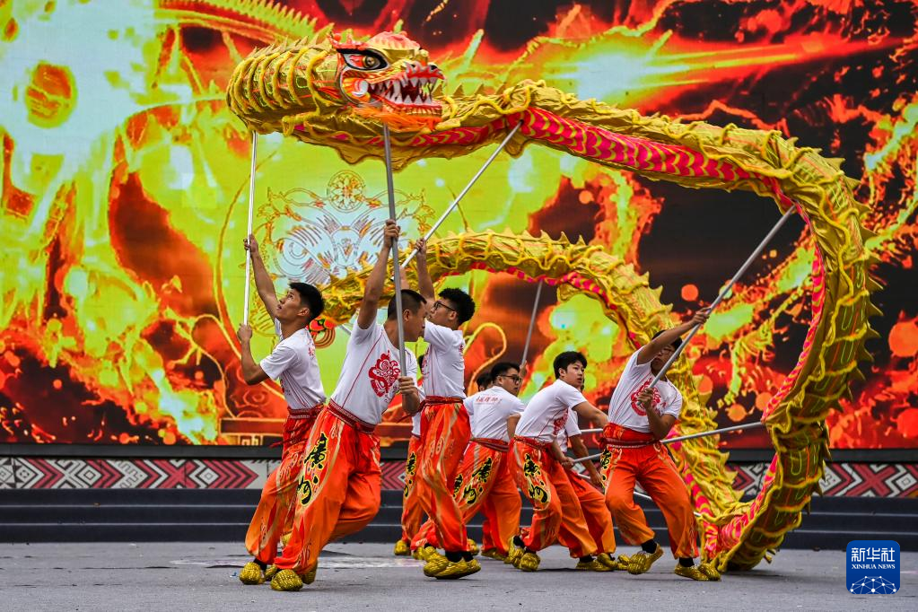 4月22日,在中国—东盟(南宁)非物质文化遗产周开幕现场,演员在表演舞龙。