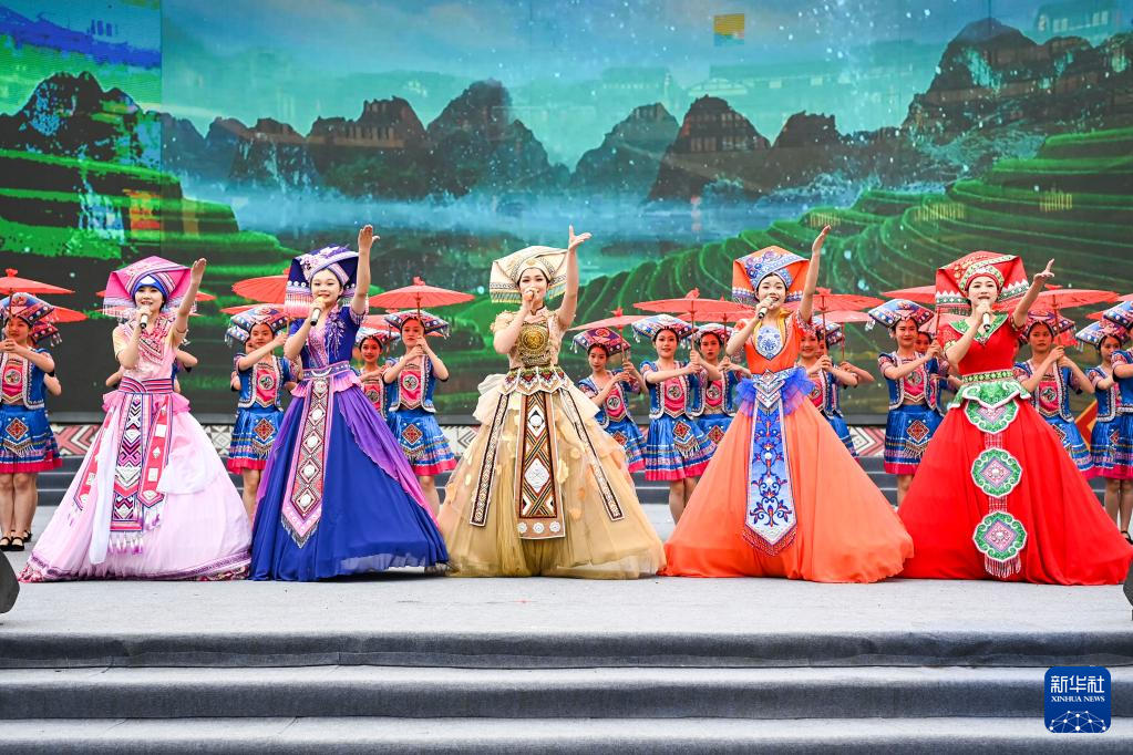 4月22日,在中国—东盟(南宁)非物质文化遗产周开幕现场,演员在表演少数民族歌舞。