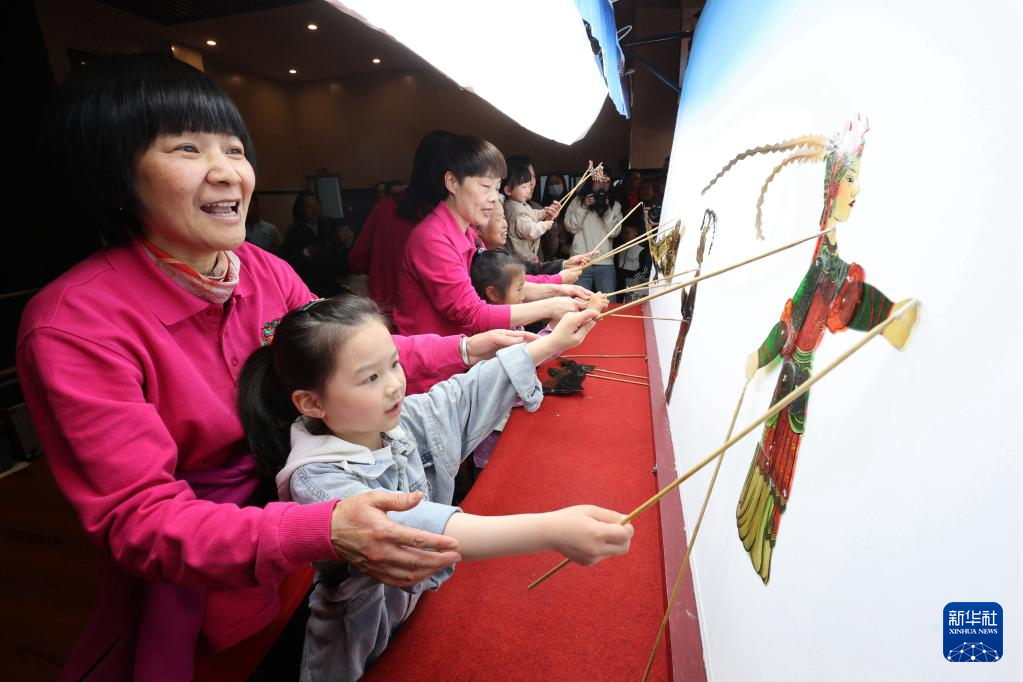 4月24日晚,在德清县禹越镇东港村文化礼堂,孩子们在体验皮影戏表演。