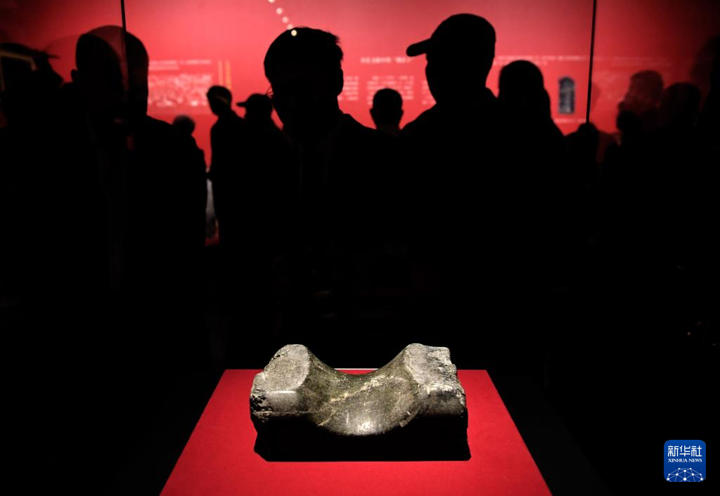 这是曹操高陵遗址博物馆内展出的“魏武王常所用慰项石”石枕(4月22日摄)。