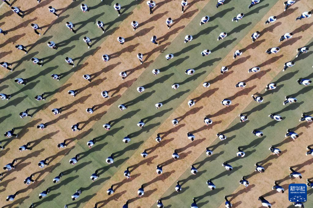 敦煌中学的学生在操场上做敦煌舞课间操(4月26日摄,无人机照片)。