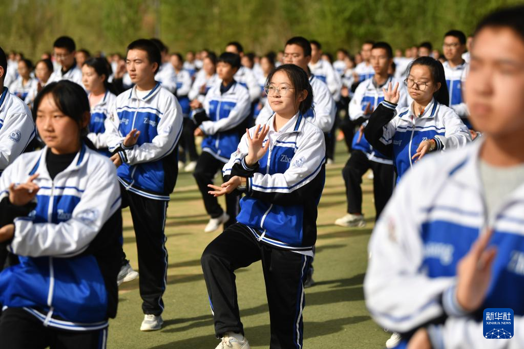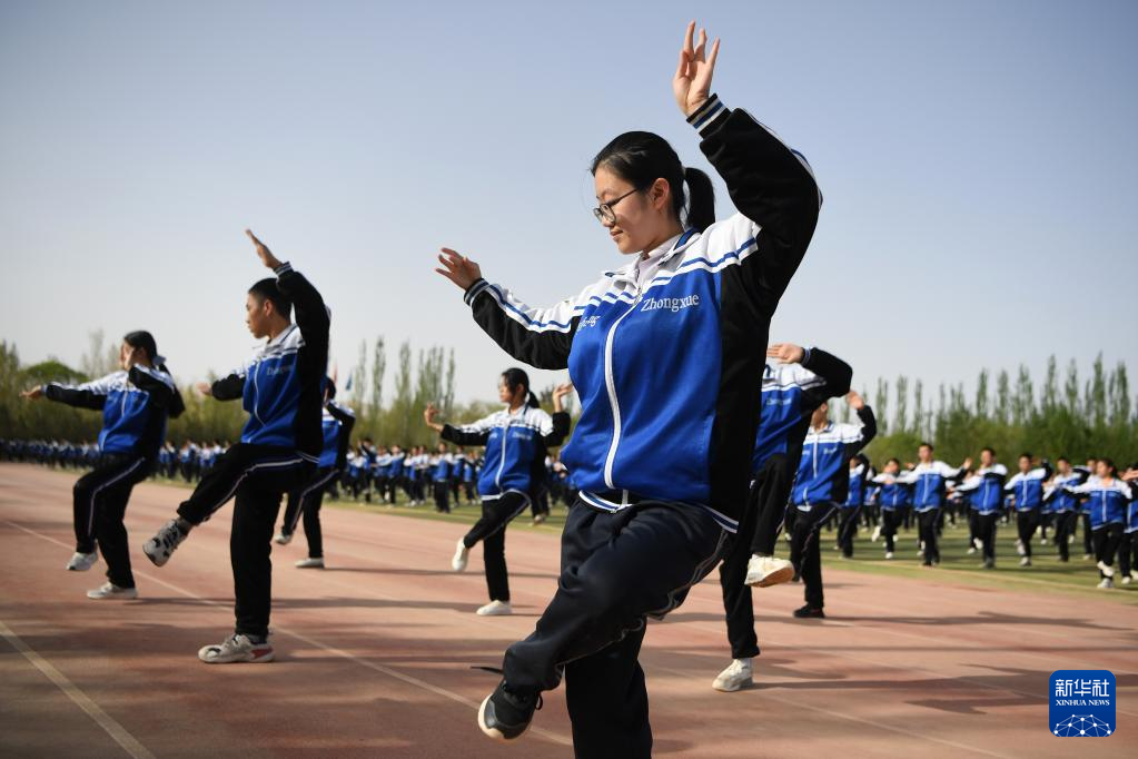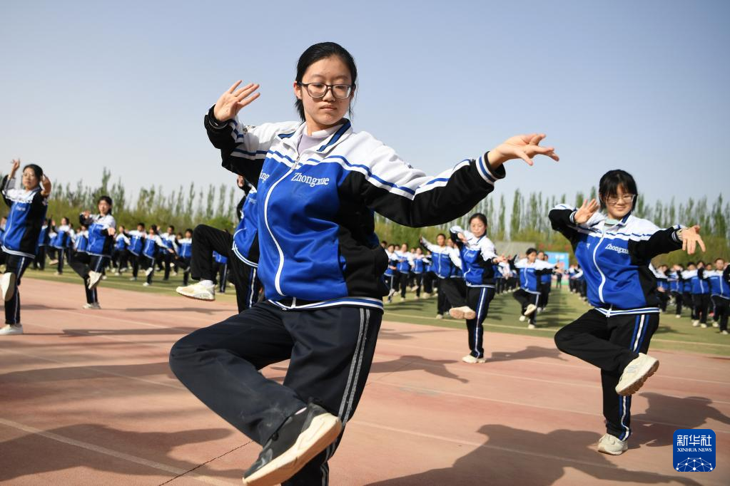 敦煌中学的学生在操场上做敦煌舞课间操(4月26日摄)。