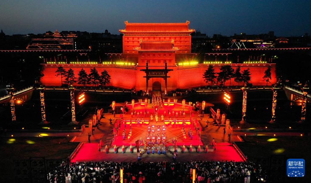 游客在西安城墙景区观看《梦长安——大唐迎宾盛礼》(4月30日摄,无人机照片)。