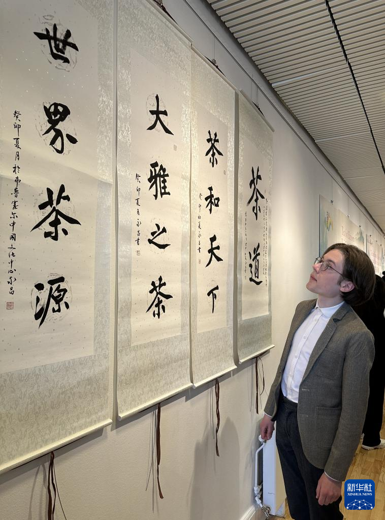 5月7日,在瑞典首都斯德哥尔摩的中国文化中心,参观者观看书法展示。