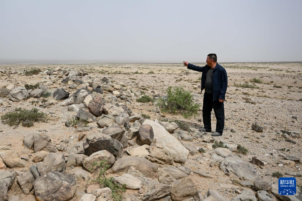 5月13日,驼峰(长城)文物保护队员许继龙在巡查阿拉善左旗一处石圈遗址。