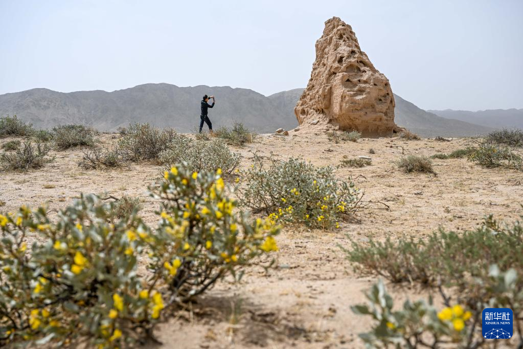 5月13日,驼峰(长城)文物保护队员布音乌力吉在阿拉善左旗一处烽火台遗址巡查并拍照记录。